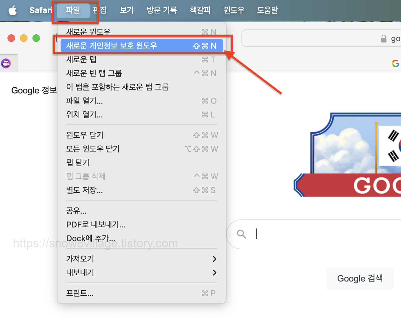 사파리 실행 후 좌측 상단 [파일] - [새로운 개인정보 보호 윈도우] 단축키는 Command + Shift + N입니다.