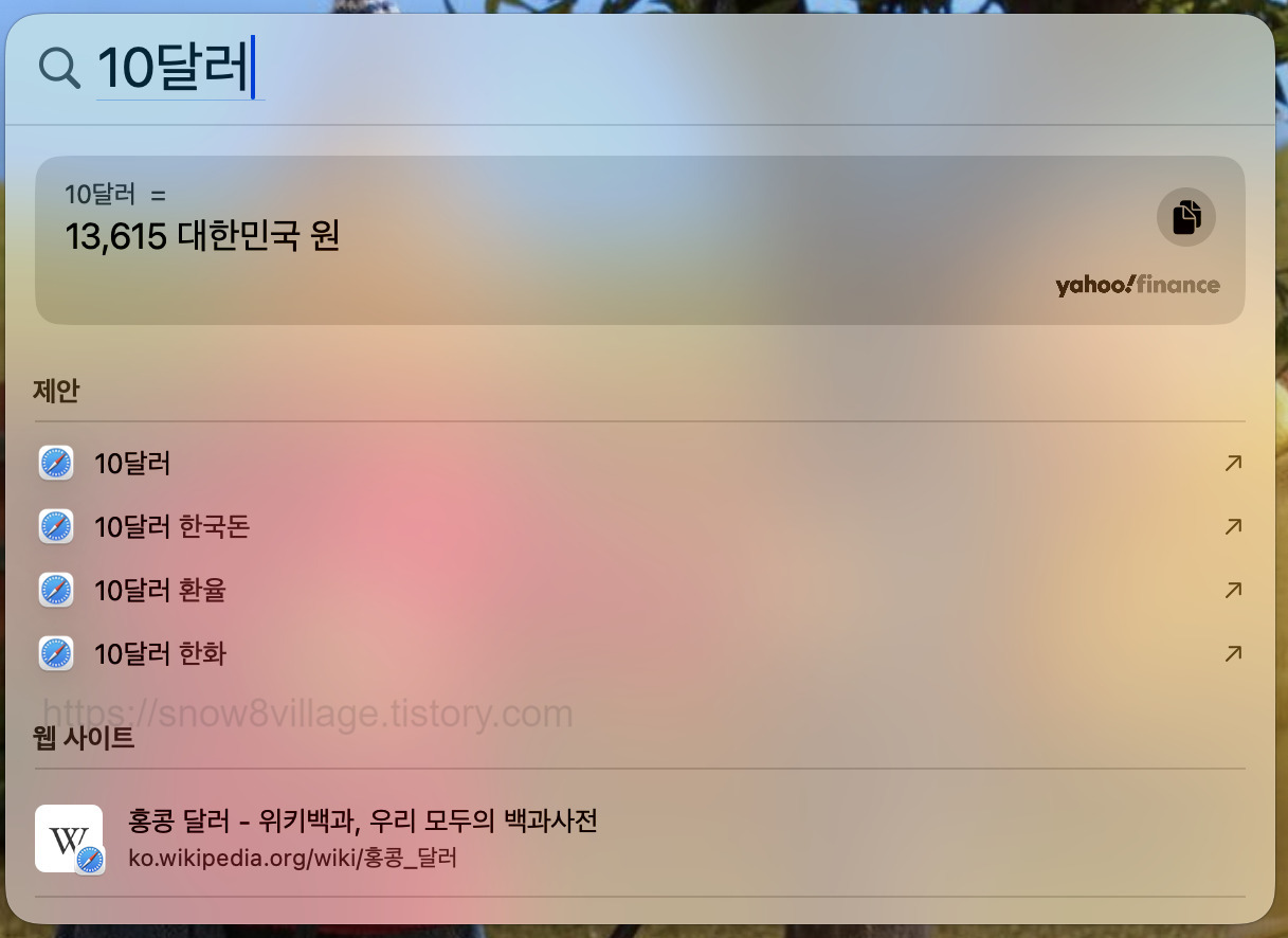 단축키는 Command + Space. 스크린샷을 검색하니 사진 앱에 있는 스크린샷을 보여주고, 사파리를 실행하지 않아도 바로 검색할 수 있도록 해줍니다. 10달러를 검색해 봤더니 바로 환율을 보여주네요!