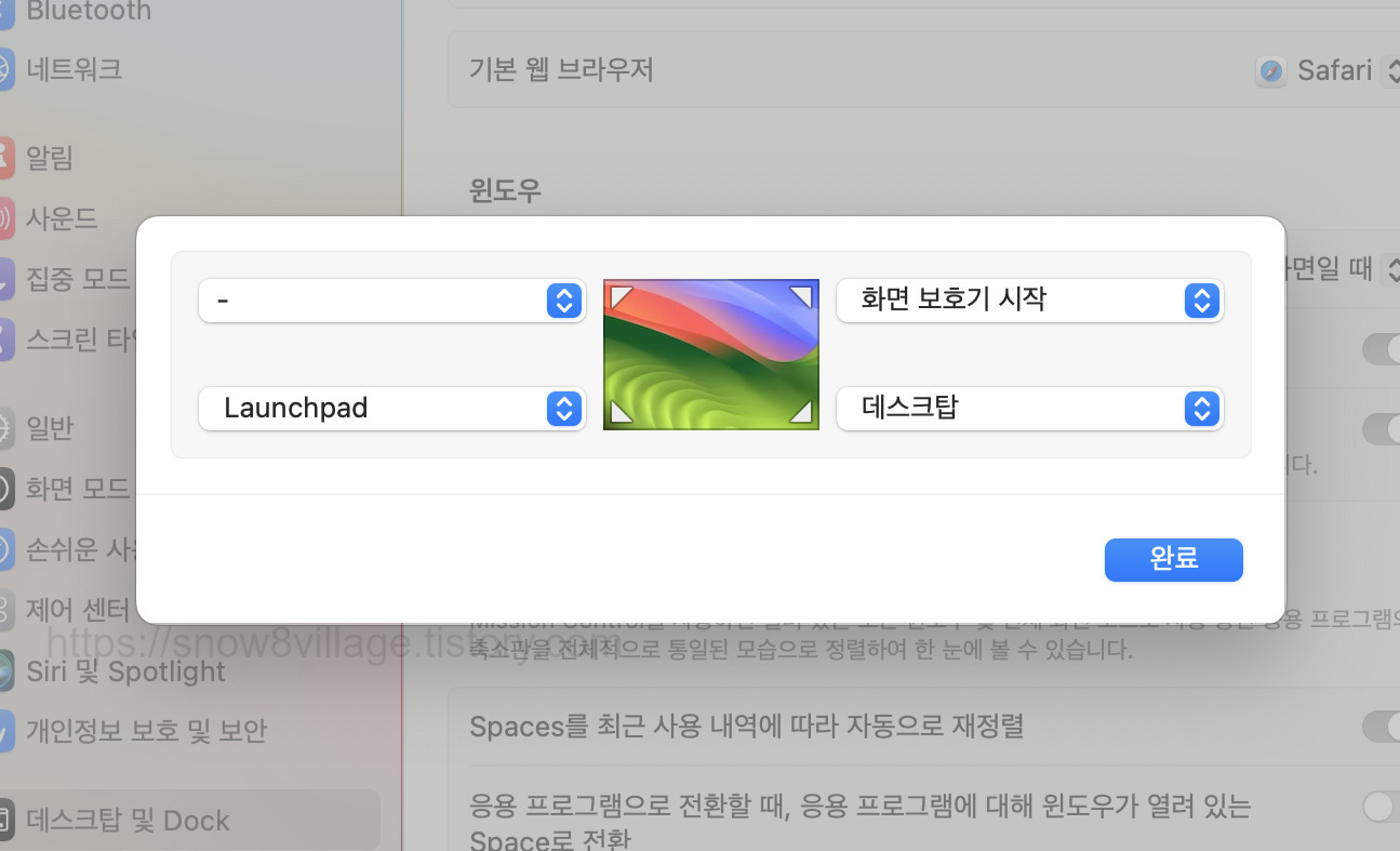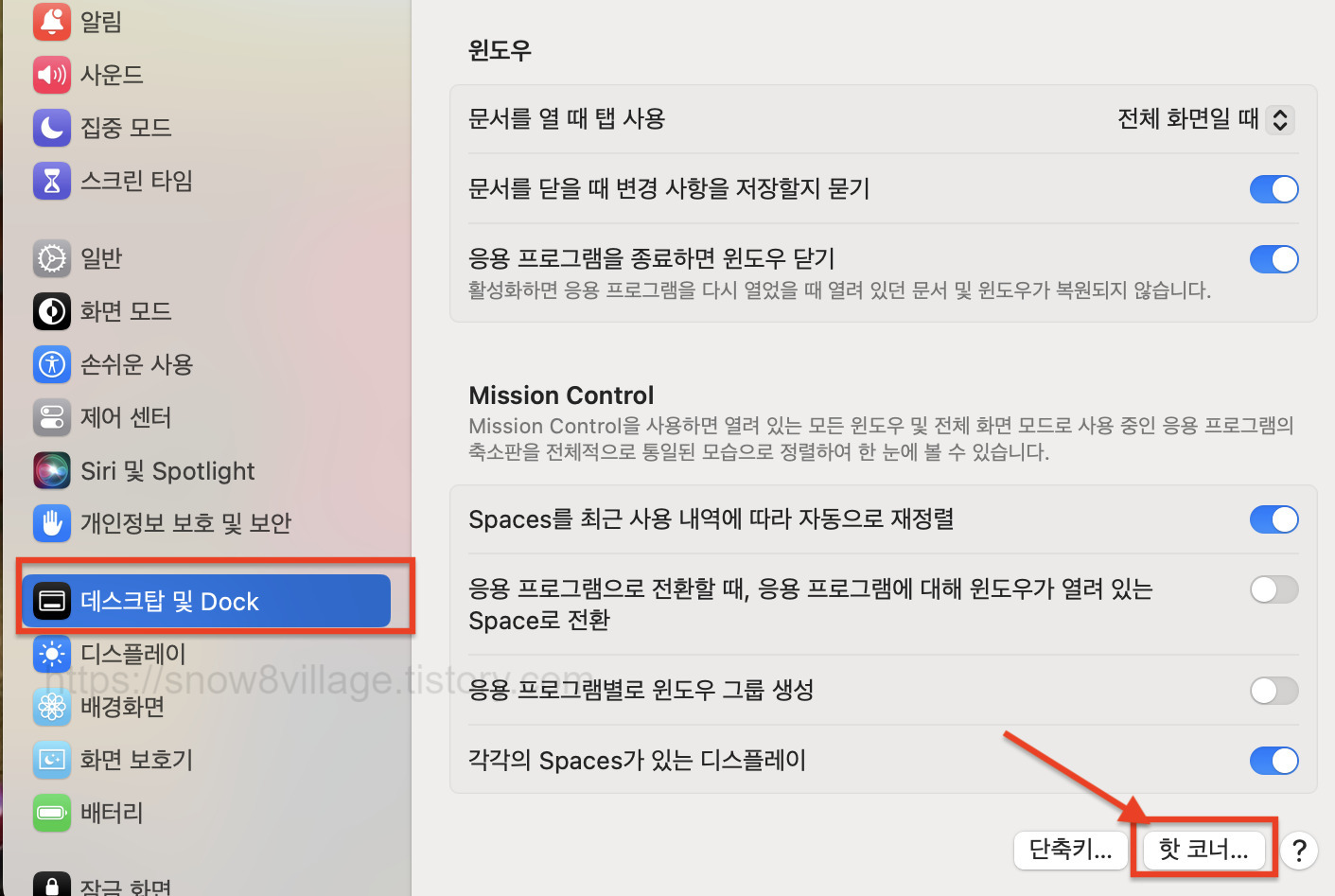 [시스템 설정] - [데스크탑 및 Dock] - [핫 코너...]로 들어갑니다.