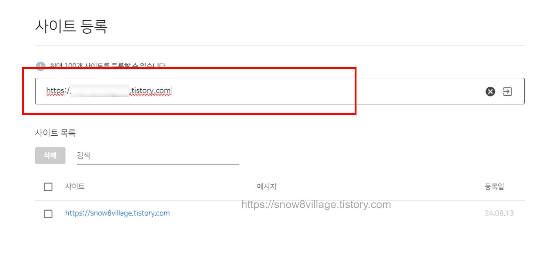 자신의 블로그 주소를 복사해 사이트등록 입력창에 붙여 넣기 해줍니다.