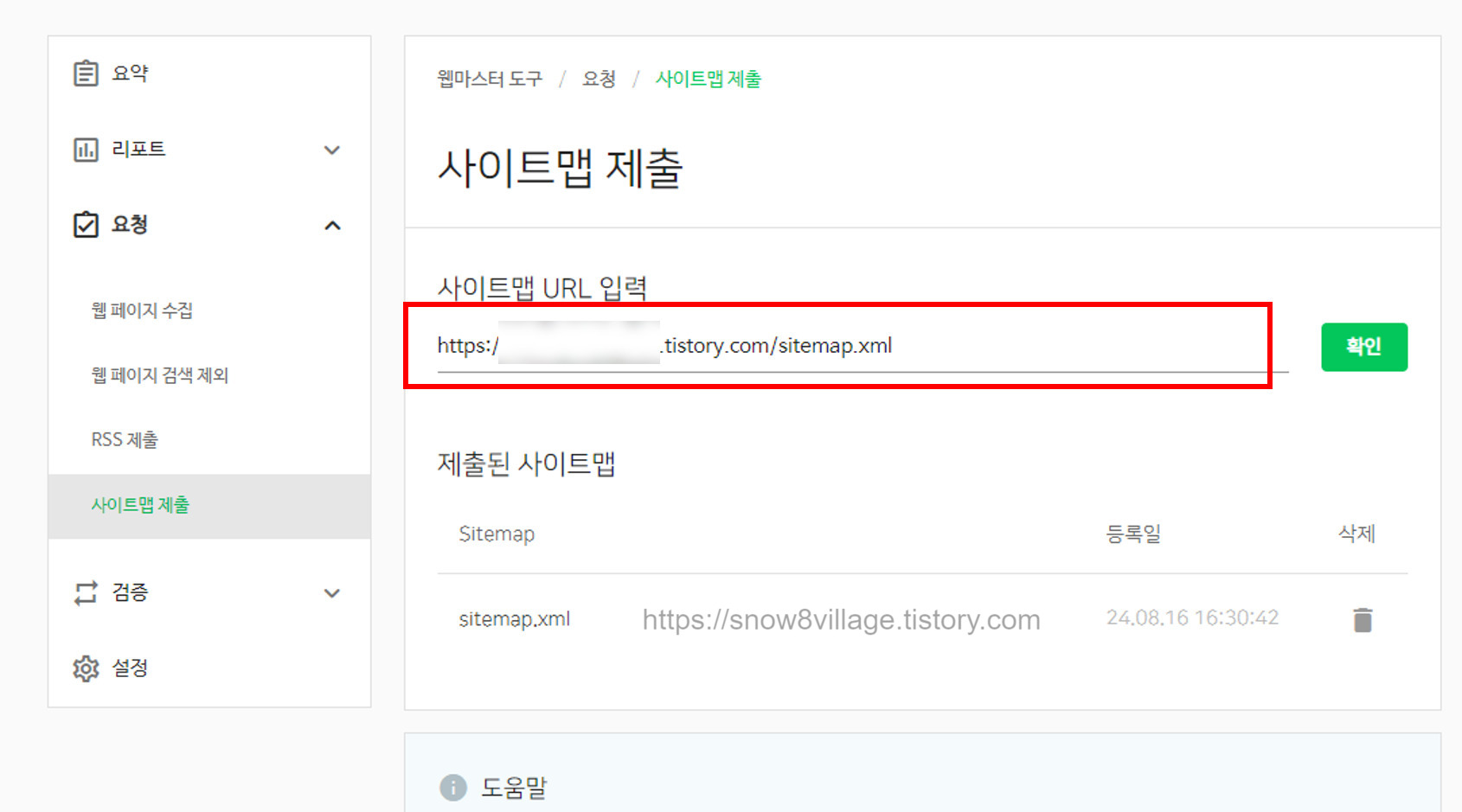 이번엔 사이트맵 제출 메뉴에 들어가 '자신의 블로그 주소/sitemap.xml'을 입력하고 확인을 눌러줍니다.