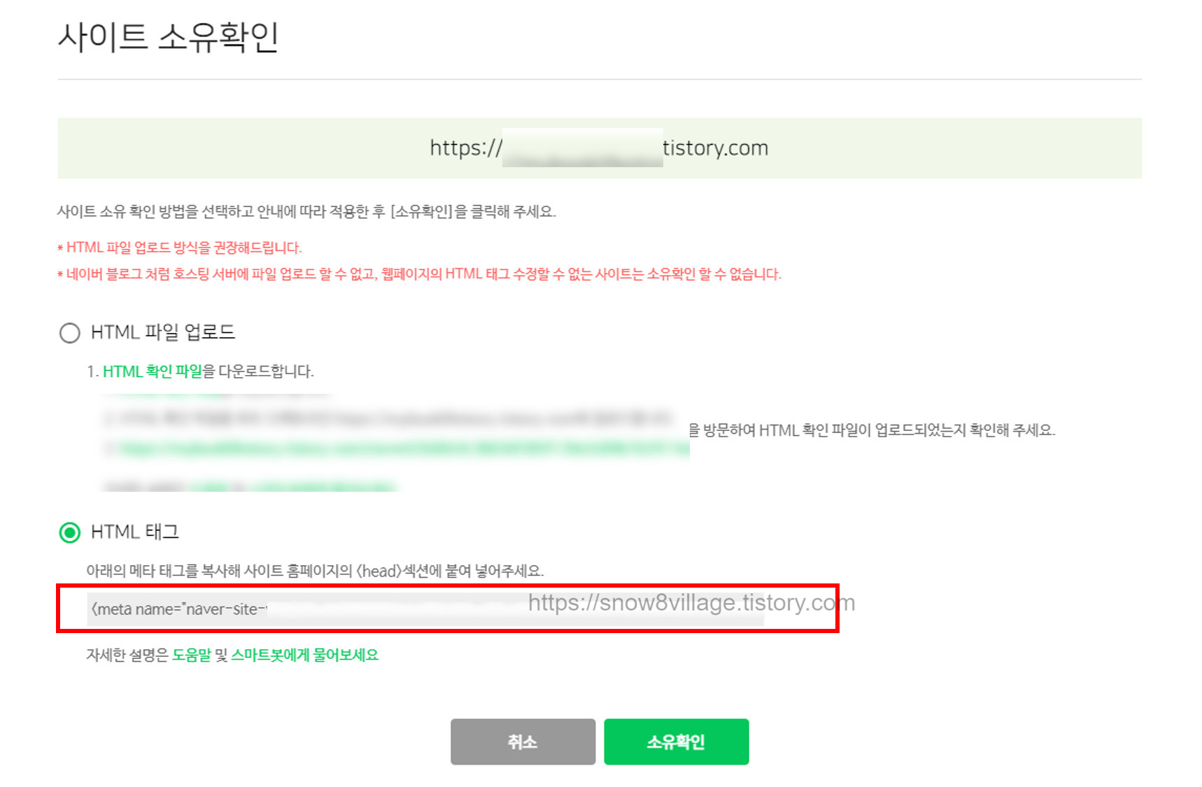 그럼 사이트 소유확인 화면이 나옵니다. HTML태그를 선택하고 메타 태그를 복사해 줍니다.