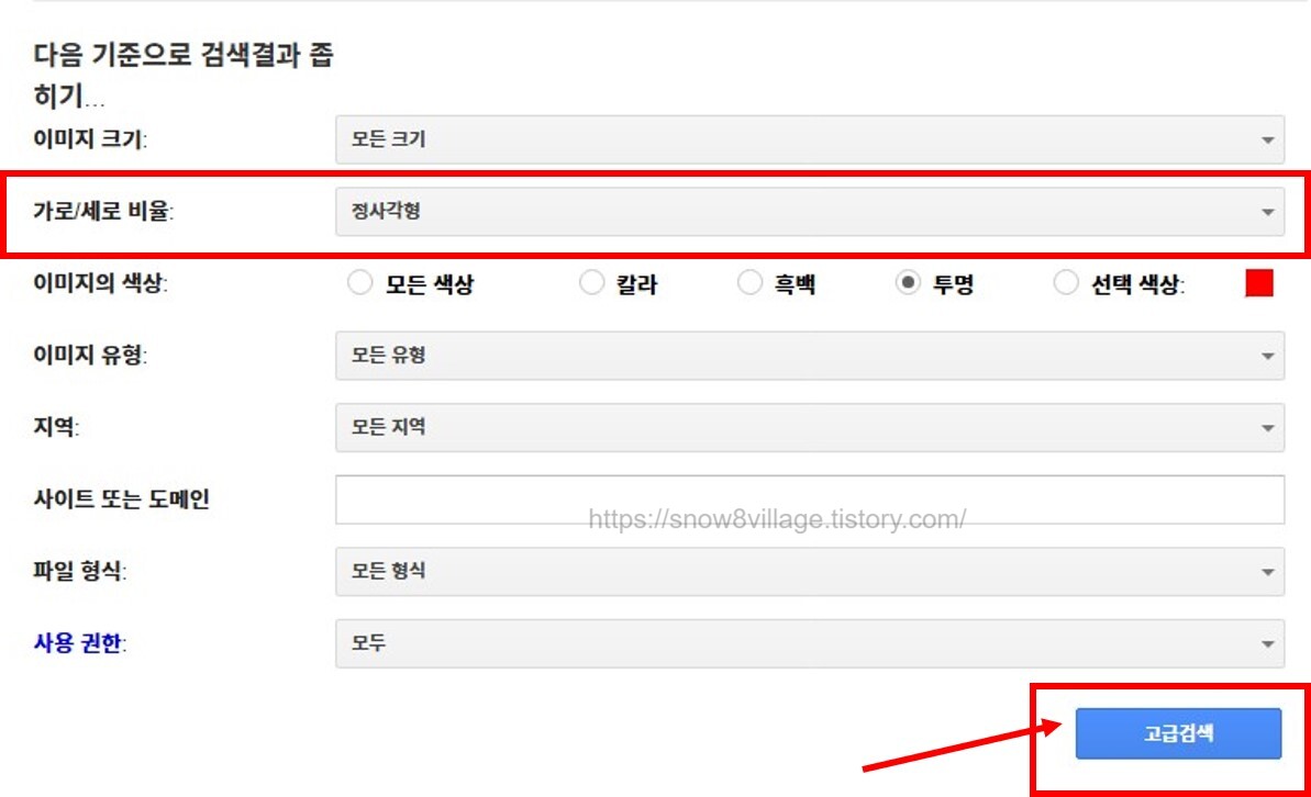 그 밑에 보면 가로/세로 비율이 있는데, 이것을 정사각형으로 바꿔준 뒤 고급검색을 해보겠습니다.
