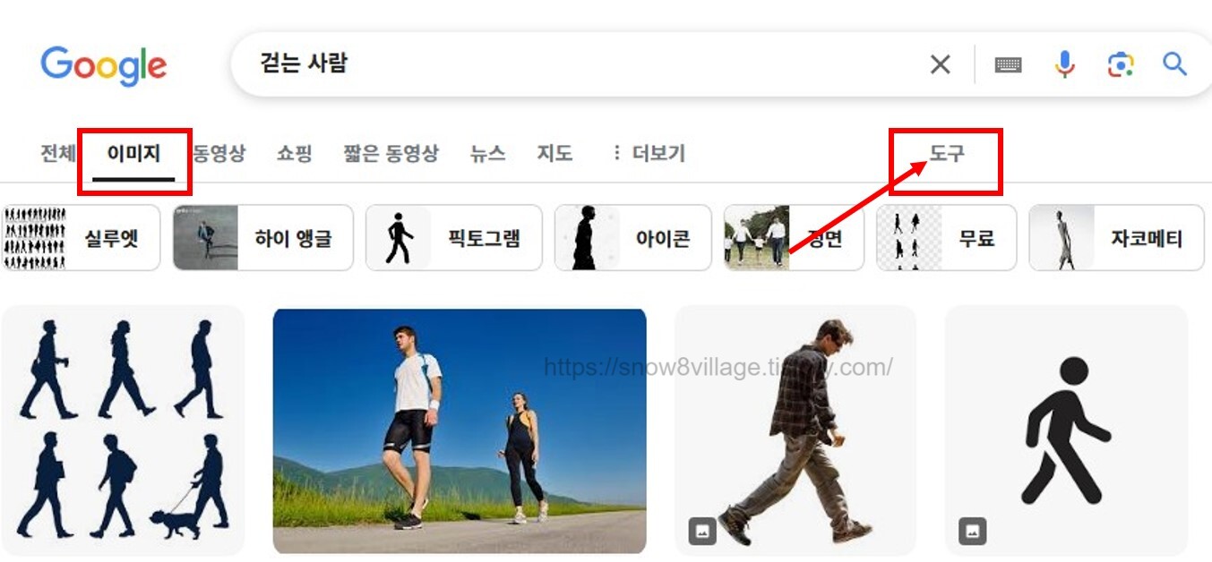 저는 걷는 사람의 이미지가 필요해 '걷는 사람'을 입력 후 검색했습니다. 그리고 이미지 항목에 [도구]를 클릭합니다.