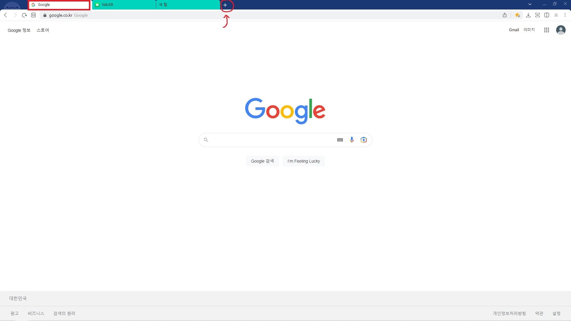 탭은 항상 맨 윗줄(창)에 붙어있습니다. 현재 Google사이트를 이용하는 탭을 보여주는 상황입니다. 마지막으로 열려있는 탭 옆에 '+'표시는 새 탭 추가 버튼입니다. 새 탭 추가 버튼을 눌러 한 개의 창에서 여러 개의 탭을 추가해 사용할 수 있습니다.